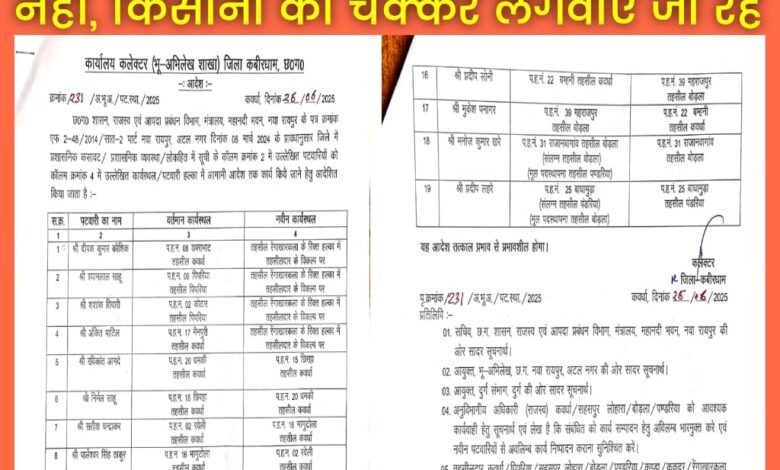 कवर्धा। जिले में कलेक्टर साहब ने 26 जून 2025 को लंबे समय से जमे पटवारियों का ट्रांसफर आदेश जारी किया। मंशा थी कि व्यवस्था सुधरे, किसानों को सुविधा मिले और हर हल्के में जिम्मेदार पदाधिकारी मौजूद रहें।