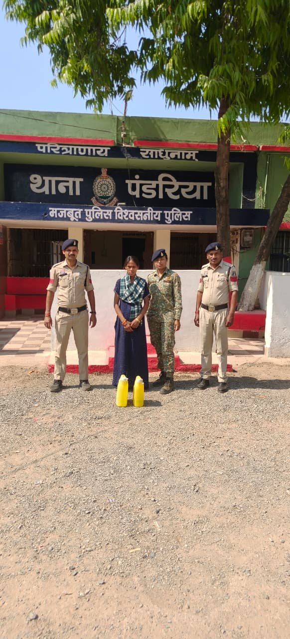 विवरण- श्रीमान पुलिस अधीक्षक महोदय कवर्धा श्री धमेद्र सिंह (भापुसे) के द्वारा समस्त थाना/चौकी प्रभारियो को अवैध शराब पर प्रभावी रूप से कार्यवाही करने एवं अंकुश लगाने हेतु निर्देशित किया गया है। जिसके परिपालन में अति.पुलिस अधी. श्री पुष्पेन्द्र सिंह बघेल (रापुसे), अति.पुलिस अधी. श्री अमित पटेल (रापुसे) एंव पुलिस अनुविभागीय अधिकारी पण्डरिया श्री भूपत सिंह धनेश्री (रापुसे) के मार्गदर्शन में थाना पंडरिया द्वारा क्षेत्र में लगातार सूचना एकत्र की जा रही है, कि इसी तारतम्य में थाना पंडरिया पुलिस को दिनांक 18.04.26 को मुखबिर द्वारा सूचना मिली कि वार्ड नं.15 बैरागपारा पंडरिया जिला कबीरधाम निवासी परमेश्वरी कोसले अवैध धन लाभ अर्जित करने के लिए अपने घर बाडी मे हाथ भट्टी से निर्मित कच्ची महुआ शराब रख कर बिक्री कर रही है कि सूचना पाकर सूचना से वरिष्ठ अधिकारियो को अवगत करा कर उचित दिशा निर्देश प्राप्त कर, त्वरित कार्यवाही करते हुए पंडरिया पुलिस द्वरा मुखबीर के बताये स्थान पर घेरा बंदी कर रेड कार्यवाही कर परमेश्वरी कोसले पति भूपेन्द्र कोसले उम्र 23 साल साकिन वार्ड नं.15 बैरागपारा पंडरिया थाना पंडरिया जिला कबीरधाम को पकडा गया, जिसके पास से 01.एक पीले रंग के 05 लीटर वाले प्लास्टिक के जेरिकेन में हाथ भट्टी से निर्मित कच्ची महुआ शराब 05 लीटर भरी हुई,02. एक पीले रंग के 05 लीटर वाले प्लास्टिक के जेरिकेन में हाथ भट्टी से निर्मित कच्ची महुआ शराब 02 लीटर भरी हुई कुल जुमला मात्रा 07 लीटर (07 बल्क लीटर) कुल कीमती 700/-रूपये को जप्त किया गया है, आरोपिया के विरूद्ध धारा 34(2) आबकारी एक्ट के तहत थाना पंडरिया में अपराध पंजीबद्ध कर विधिवत कार्यवाही कर आरोपिया को न्यायिक रिमांड पर जेल भेजा गया है। उक्त कार्यवाही में प्रआर. 335 हरिशचंद्र साहू आरक्षक- अभिषेक शर्मा, विकाश जांगडे, म.आर.रत्नी मरावी, दीपा का विशेष योगदान रहा।